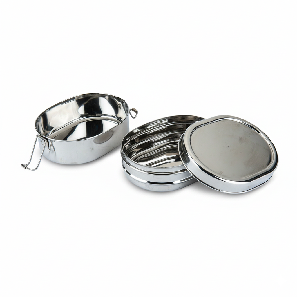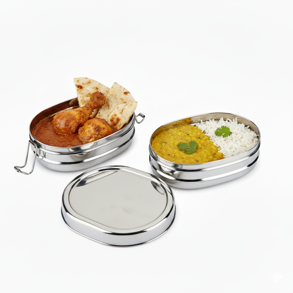 Premium Stainless Steel Lunch Box (300 ml) with two compartments — ideal for school, college, office or travel. Made from BPA-free, food-grade stainless steel to keep your meals healthy and safe. Leak-proof locking clips prevent spills, and its polished finish adds an elegant look. Lightweight, compact, and durable design.
